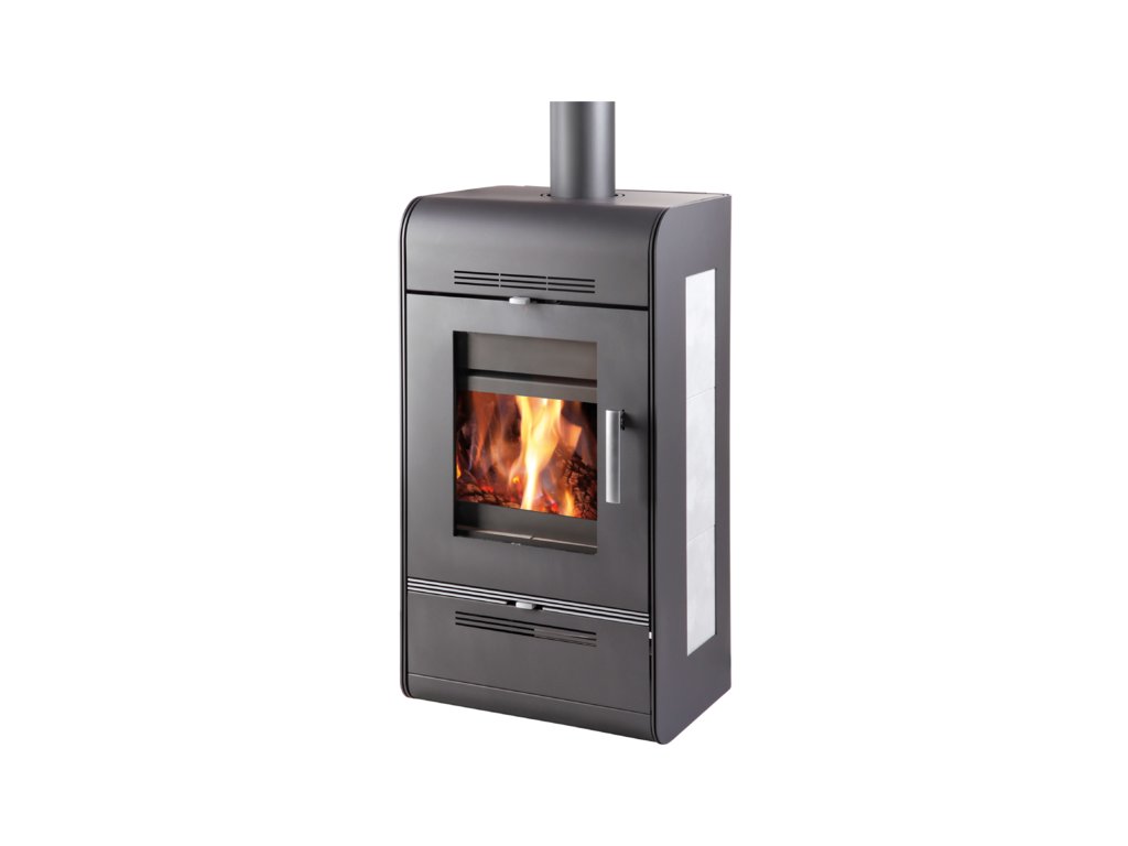 Antracitová krbová kamna s výkonným výměníkem a šedou dlažbou na bocích, HAAS+SOHN, ANDRUS