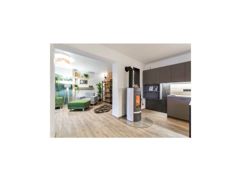 Antracitová kulatá krbová kamna s bílými boky, HAAS+SOHN, ANTIC