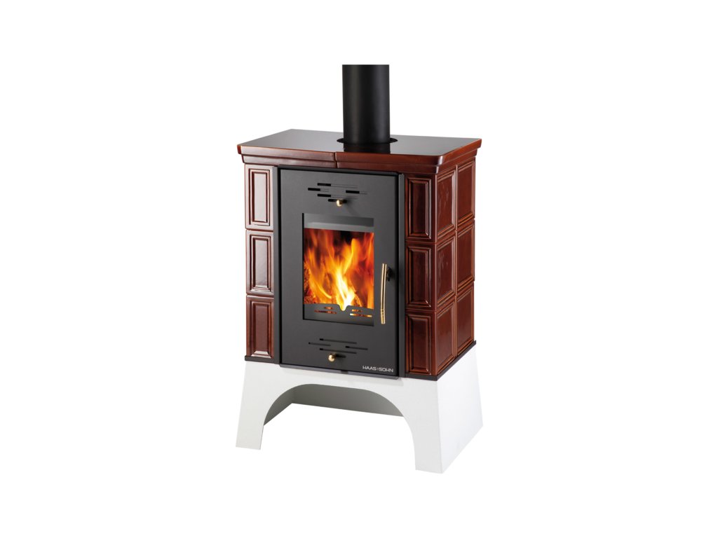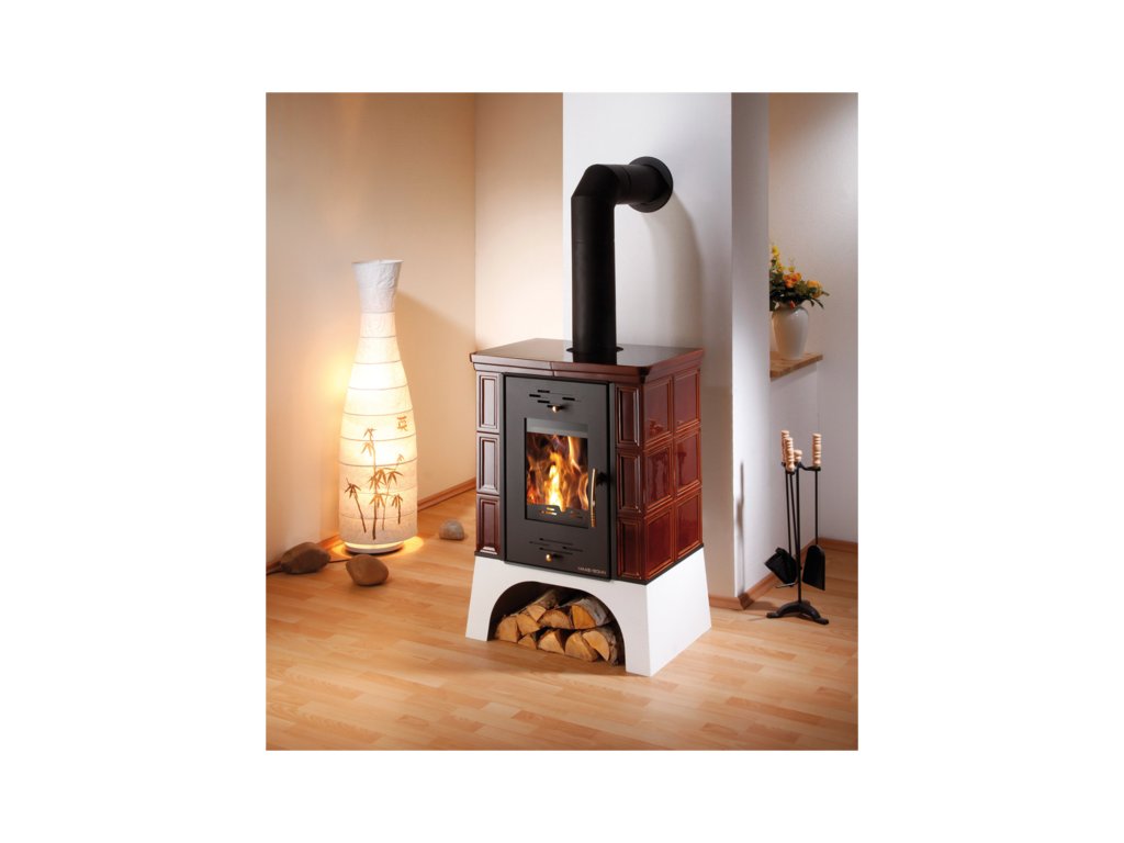 Kachlová kamna s hladkými hnědými kachlemi, HAAS+SOHN, EBOLI
