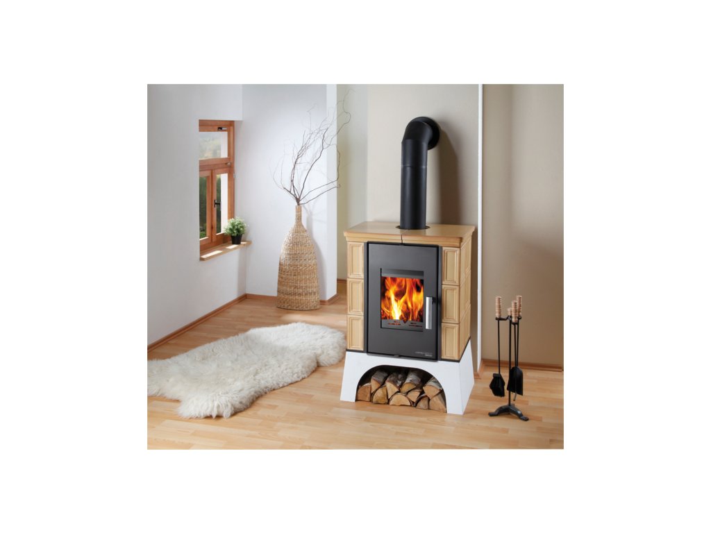 Béžová kachlová kamna s výměníkem a vychlazovací smyčkou, HAAS+SOHN, EBOLI