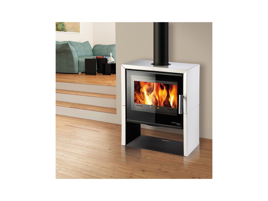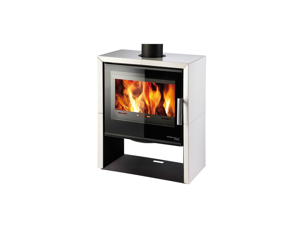Hranatá moderní krbová kamna s bílým kachlovým obkladem, HAAS+SOHN, JONSBO