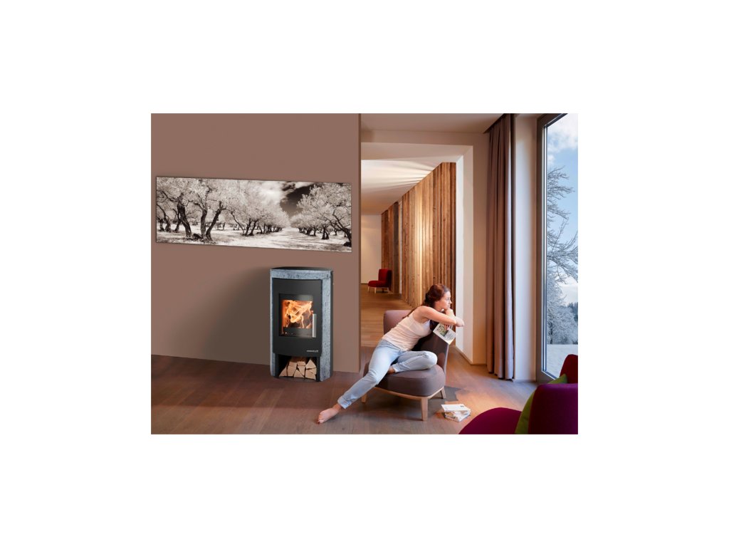 Černá krbová kamna s šedým mastkovým obkladem s texturou, HAAS+SOHN, MADERIA