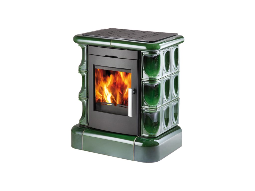 Moderní kachlová kamna se zelenými hladkými kachlemi a černou kovovou římsou, HAAS+SOHN, MANTA