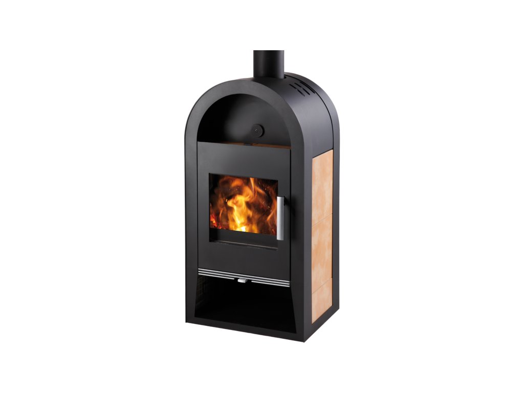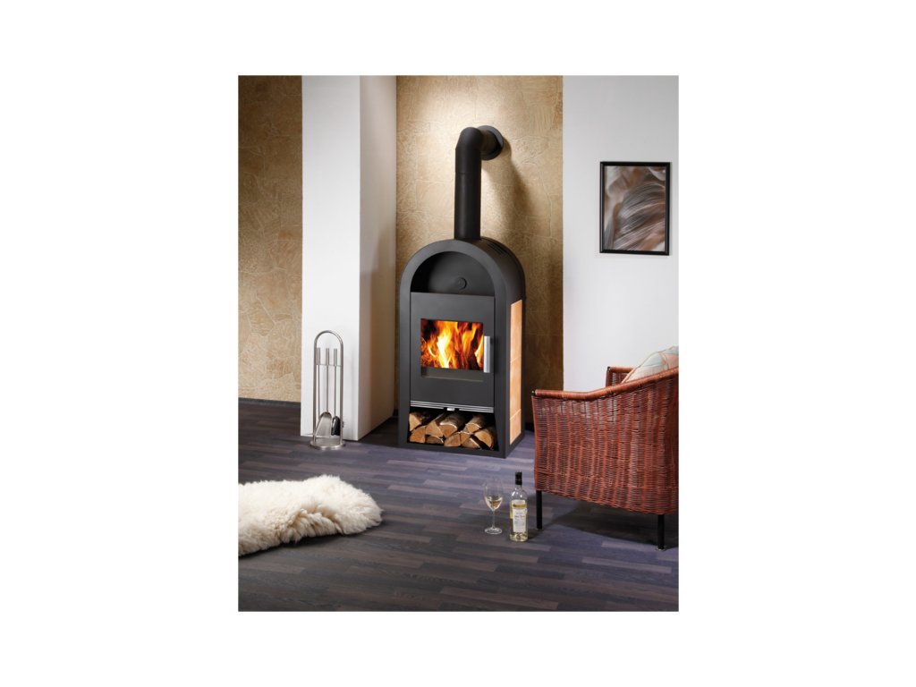 Krbová kamna s výměníkem s prostorem na dřevo, píckou a béžovou dlažbou, HAAS+SOHN, NIVALA