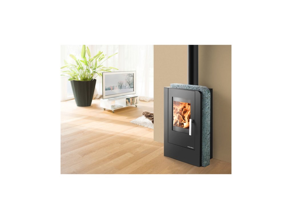 Mělká krbová kamna s ozdobným šedým kamenným obloukem, HAAS+SOHN, NORDBY