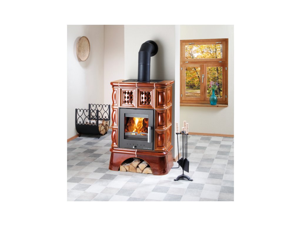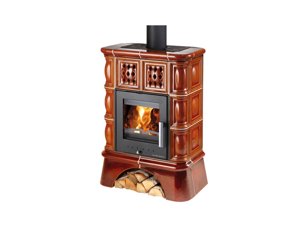 Kamna s kachlemi v medové barvě, výměníkem a kachlovým soklem, HAAS+SOHN, TREVISO II